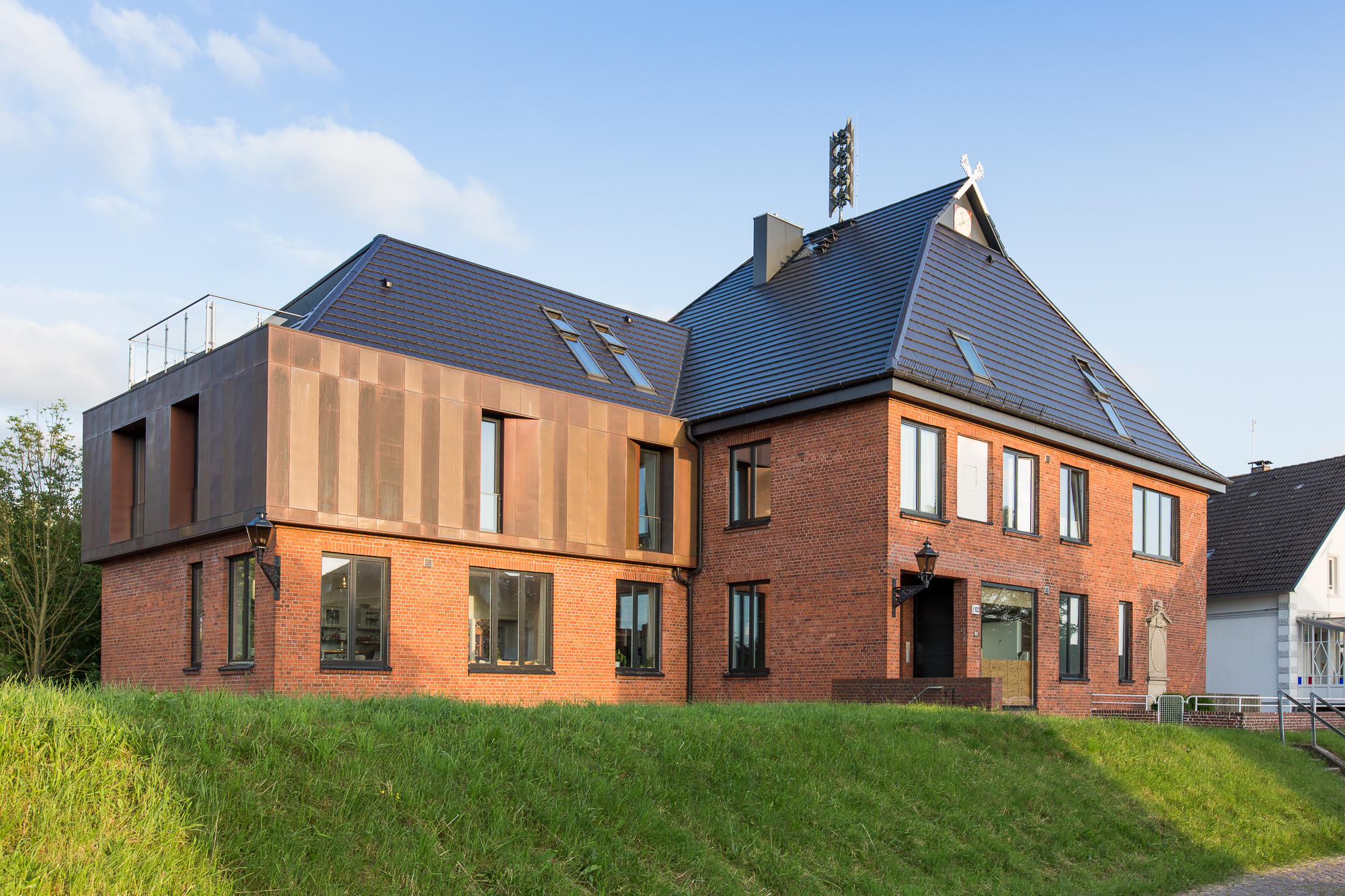 Der alten Schule eine neue Nutzung geben und zeitgleich moderne Elemente integrieren bei einer komplett neuen flutsicheren neuen Tiefengründung unter dem Bestand.